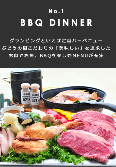 夕食を下記パターンからチョイス!グランピングの定番BBQ、 ぶどうの樹グループで人気のレストランからチョイス!