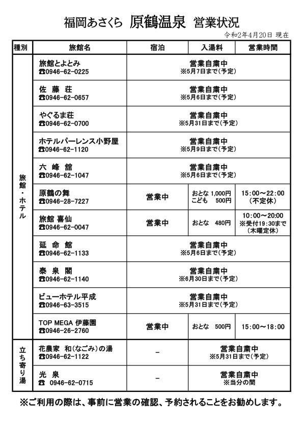 原鶴温泉旅館協同組合加盟旅館ホテルおよび立ち寄り湯営業の状況について(2020-04-20現在)
